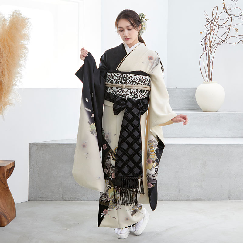 白黒を基調にした大人カッコいいシックな振袖。オプションのパールが付いた重ね衿が、襟元を華やかにしてくれています。